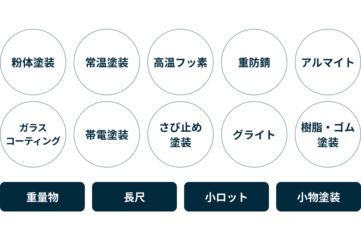 粉体、常温乾燥、高温フッソ、重防食、アルマイト、ガラスコーティング、帯電塗装、さび止め塗装、グライト、重量物、長尺、小ロット、小物塗装、開発、試作、樹脂塗装、ゴム塗装